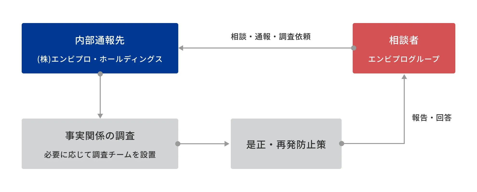 エンビプログループではエンビプログループ内における法令違反その他不正行為の早期発見、適切な対応策が執れるよう「内部通報に関する規程」を設け、エンビプログループ全従業員に周知しております。