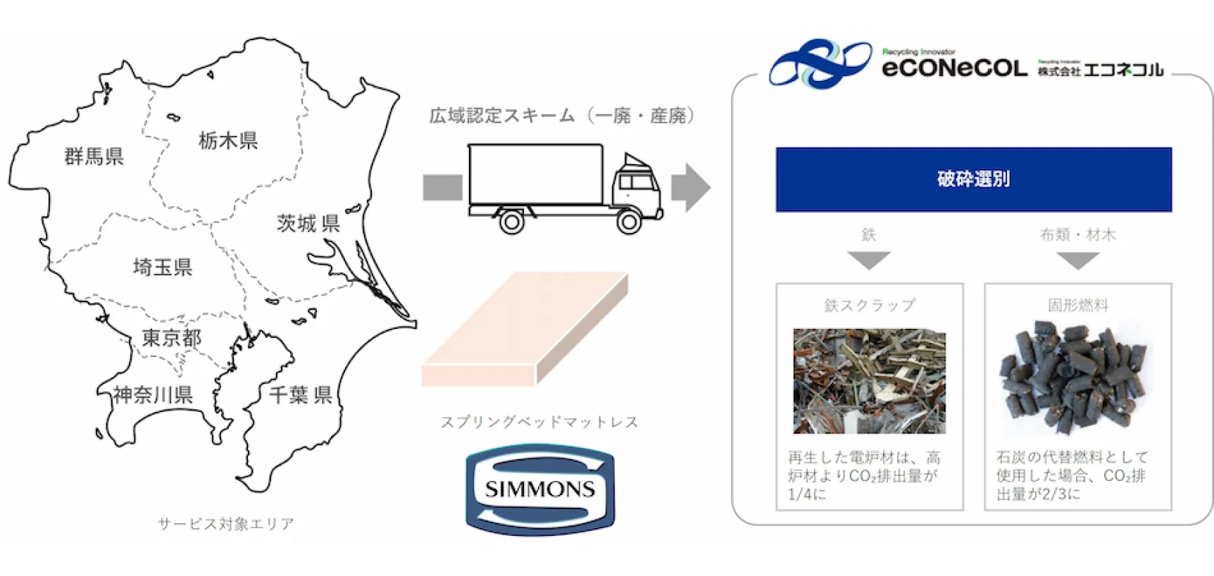 シモンズ株式会社が回収から再資源化までのサーキュラースキームを構築。当社は設備メーカーと高性能破砕機の共同開発を行い、人的な作業負担を最小限に抑えた効率処理を実現し、サーキュラーエコノミーの原則の一つである「一度経済システムに投入された資源を徹底的に使いまわす」を実現する支援をしました。